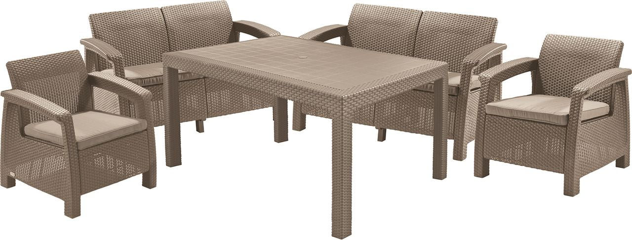 Удобный комплект мебели из искусственного ротанга производства фирмы KETER Group. Широкий диван позволяет поместится большому количеству людей, а высокие спинки мебели создают прекрасные условия для отдыха на открытом воздухе.