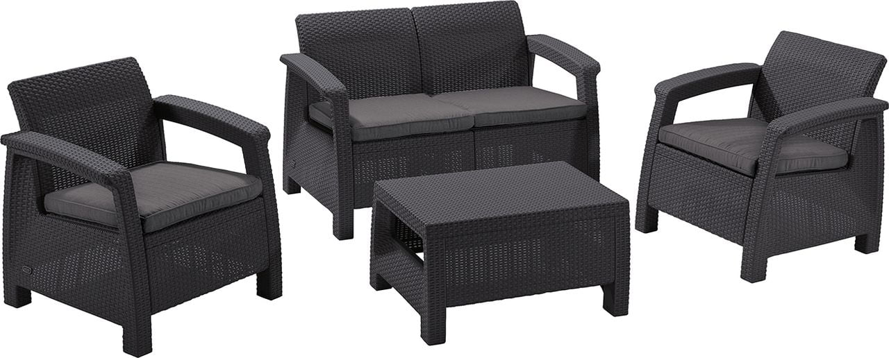 Удобный комплект мебели из искусственного ротанга производства фирмы Keter. Широкий диван позволяет поместится большому количеству людей, а высокие спинки мебели создают прекрасные условия для отдыха на открытом воздухе.