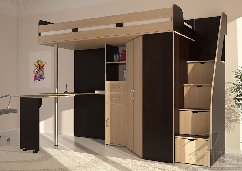 Детская МИЙА - это кровать-чердак или даже детский комплекс, который соединил: полноценное спальное место, безопасные лесенки с функцией комода, вместительный угловой шкаф с полками и штангой, функциональный пенал с полками и ящиками и конечно же удобный, раздвижной рабочий стол.