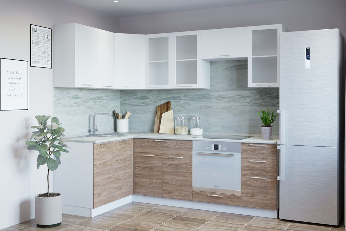 Гарнитур кухонный 1400*2400 (врезная мойка) белый грунт/ель карпатская