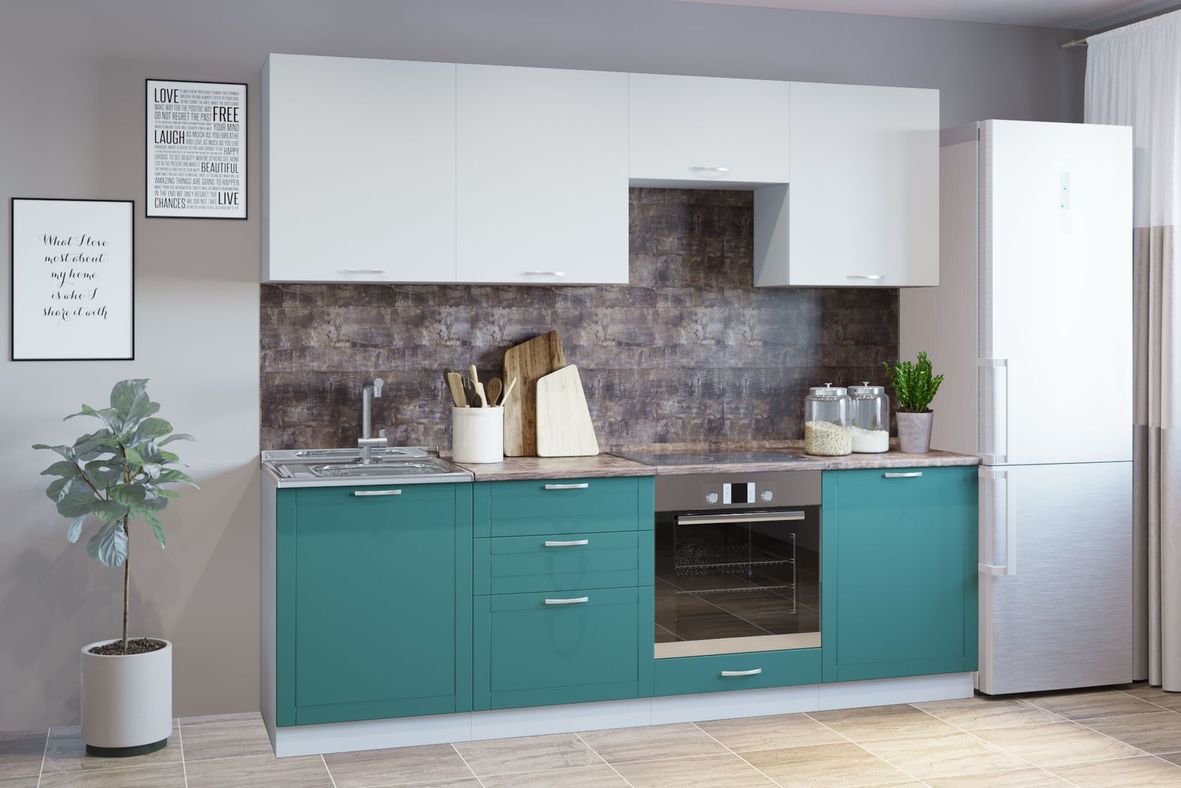 Гарнитур кухонный 2400 (накладная мойка) белый грунт/супермат бирюза