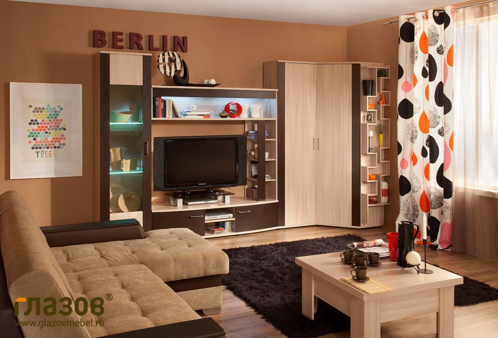 Если в гостиной Вы хотите предусмотреть не только место для ТВ, но и для хранения одежды, посуды, памятных подарков, предлагаем рассмотреть вариант компоновки модулей коллекции BERLIN, необходимых по функционалу.