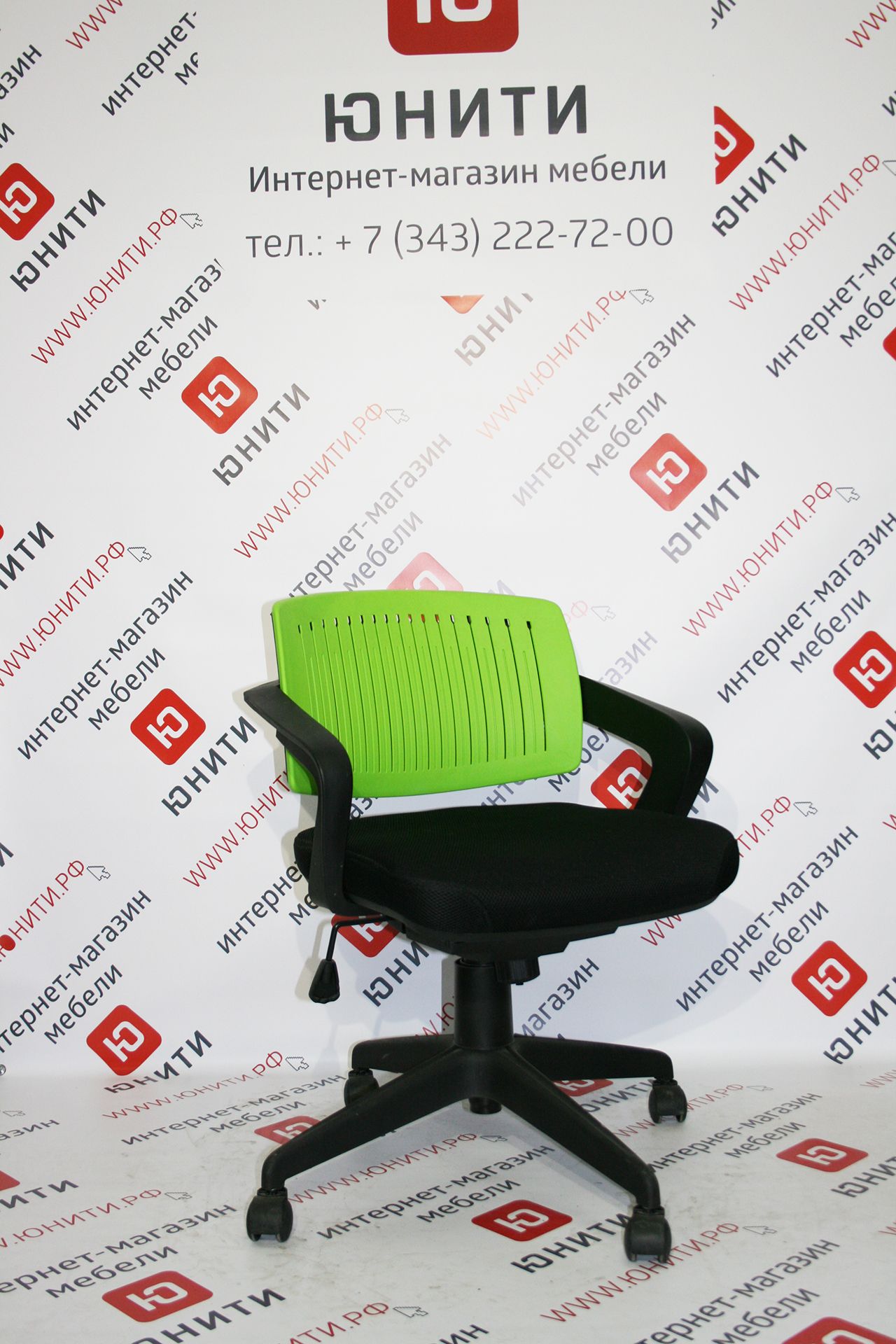 Особенность изделия в четырехлучевой крестовине и яркой комфортной спинке из пластика, повторяющей изгиб спины.