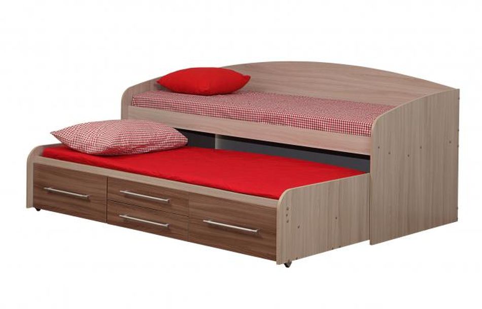 - Двухъярусная кровать имеет необычную компоновку. У неё выдвижное нижнее спальное место, благодаря чему общая высота кровати составляет всего 66 см.