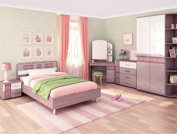 У кровати оригинальное изголовье, фасад с МДФ фрезеровкой и стеклянной вставкой с печатью. Ножки регулируются и могут компенсировать неровности пола. Спальное место 1200-2000.
