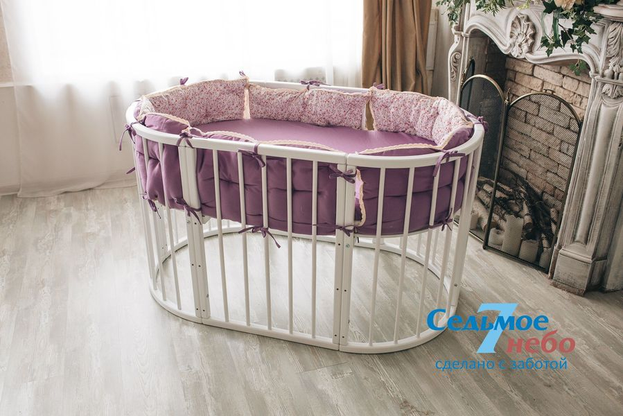 Особенности Кроватка-трансформер имеет 6 вариантов трансформации: круглая кроватка (колыбель) и пеленальный столик; овальная кроватка; диванчик; манеж; столик и два стульчика.