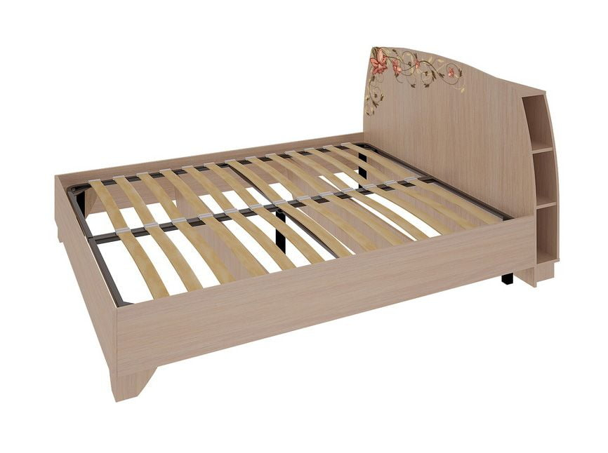 Большая двуспальная кровать, выполненная в светлых тонах с очаровательным цветочным рисунком на высоком изголовье. Особенность модели — небольшие ниши с полочками, которые прячутся внутри изголовья и заменяют прикроватные тумбочки. Мобильный телефон, крема и аксессуары всегда будут под рукой. Основание — ортопедическое. Размер спального места — 1600 х 2000 мм. Обратите внимание! Вы можете выбрать удобный вариант покупки кровати: с матрасом или без него. С моделью матраса, который входит в комплект кровати, можно ознакомиться в разделе «Аксессуары». Кровать изготавливается из ЛДСП, края обработаны кромкой ПВХ. Каркас основания — металл, ламели — дерево. Рисунок на изголовье нанесен при помощи принтерной печати.