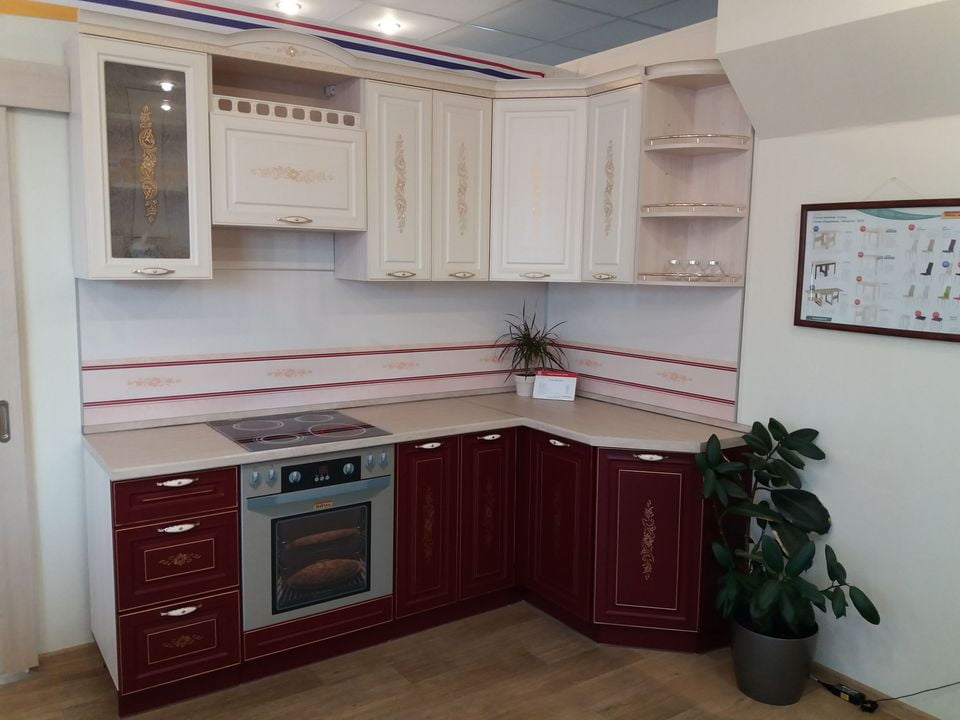 Новинка от фабрики Витра - модульная кухня Виктория, выполненная в цветовом стиле: цвет корпуса: сосна «Астрид», цвет фасадов шкафов: «Ваниль»; цвет фасадов столов: «Бордо».