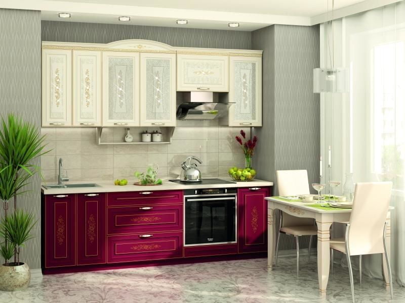 Новинка от фабрики Витра - модульная кухня Виктория, выполненная в цветовом стиле: цвет корпуса: сосна «Астрид», цвет фасадов шкафов: «Ваниль»; цвет фасадов столов: «Бордо».