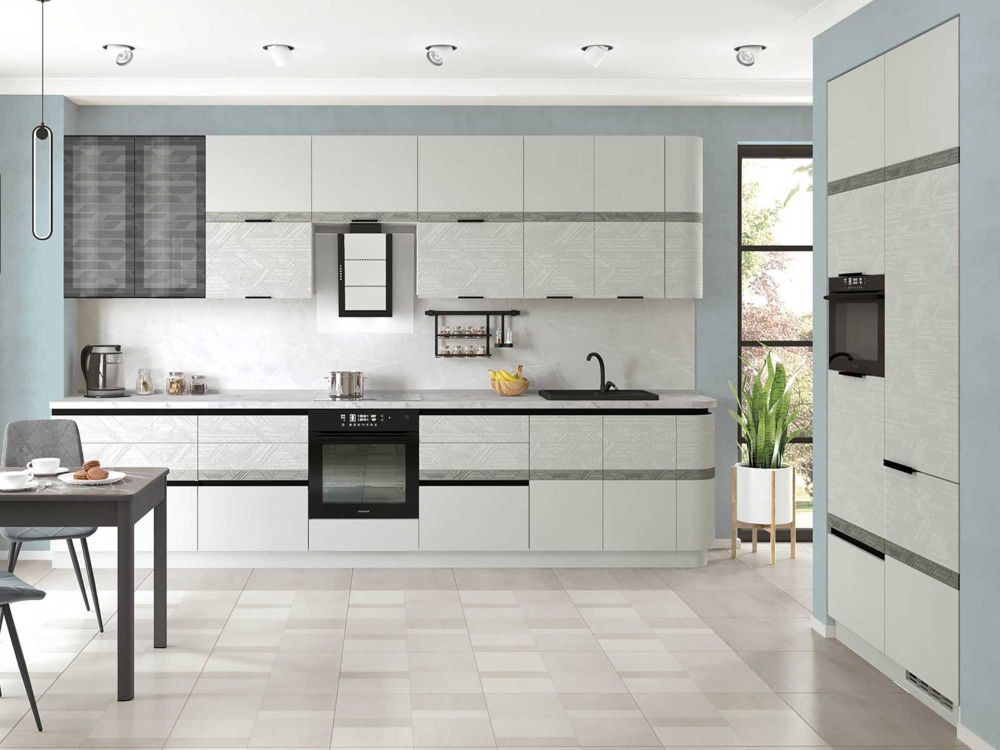 Кухня «Бостон» - воплощение современных тенденций и неповторимого стиля. Отличительная особенность коллекции – сочетание лаконичных форм и высокой функциональности. Актуальный серый цвет является универсальным и легко сочетается с различными цветами и фактурами. Объемное дизайнерское тиснение на фасадах подчеркивает современный стиль кухни. А рельефный рисунок придает оригинальный внешний вид. Контрастные акцентные вставки на фасадах с объемным патинированным рисунком создают сложный образ и придают индивидуальность Вашей кухне.