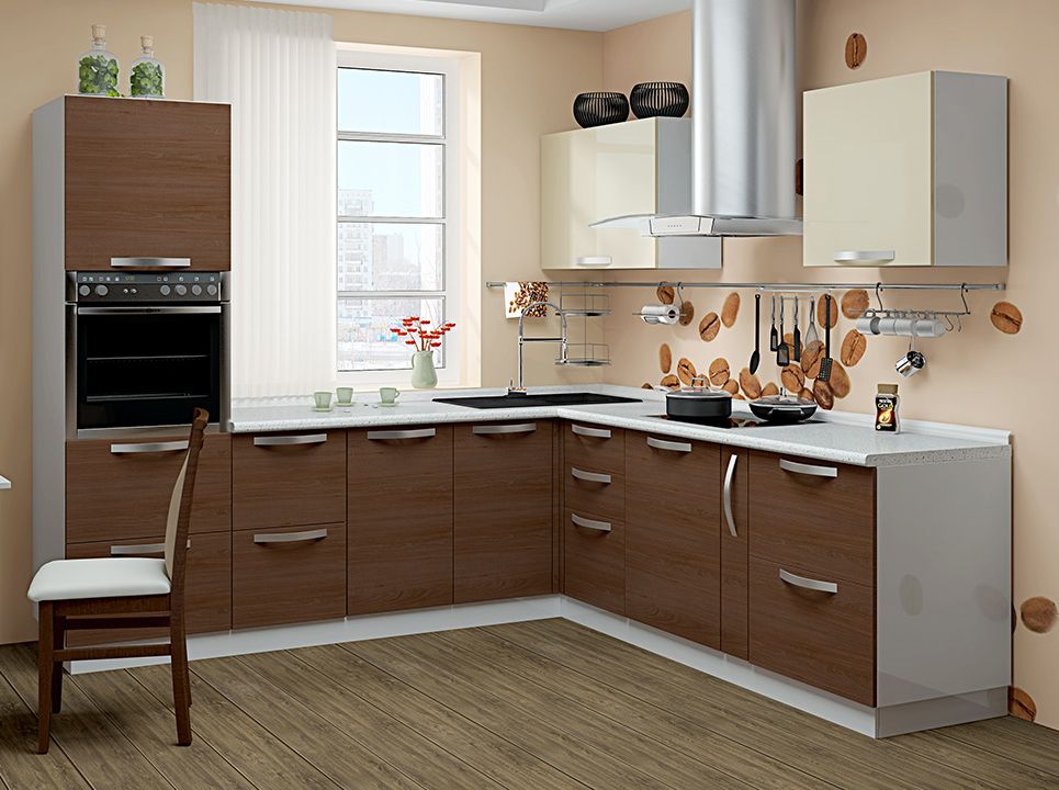 Удобная компоновка модулей гарантированно обеспечит вашей кухне максимальное удобство и функциональность. В гарнитур входят навесные и напольные шкафы с полками, выдвижными ящиками и корзиной, а также практичные столешницы «Белый Камень». Особенность комплекта заключается в наличие напольного шкафчика со специальной планкой, при помощи которого можно расположить мебель в углу комнаты.