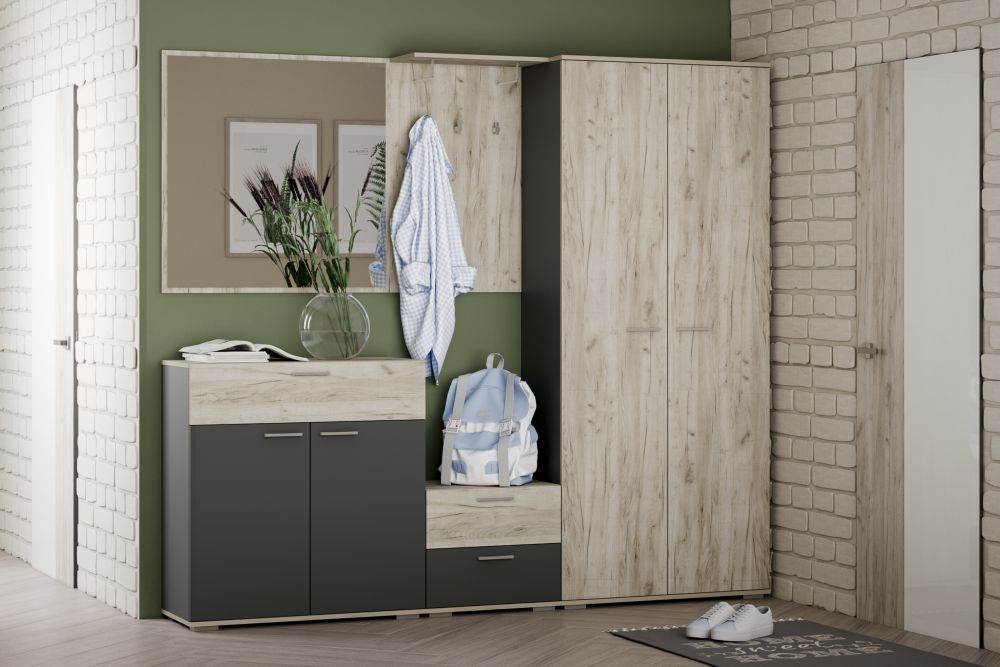 "САНТИ" - это современная модульная коллекция прихожих, имеющая в своем составе 9 элементов. За счет оригинального подбора лаконичных и функциональных модулей удается добиться эффекта простоты. Исключив лишние детали - оставить достаточно места в небольшом помещении. Цветами, наиболее подходящими для создания привлекательного помещения, остаются белые, серые, песочные оттенки. Они отлично комбинируются между собой, дают отдых глазам. Подобное оформление поможет совместить функциональность и красоту помещения и сделать даже небольшую комнату уютным местом для приема гостей и хранения вещей.