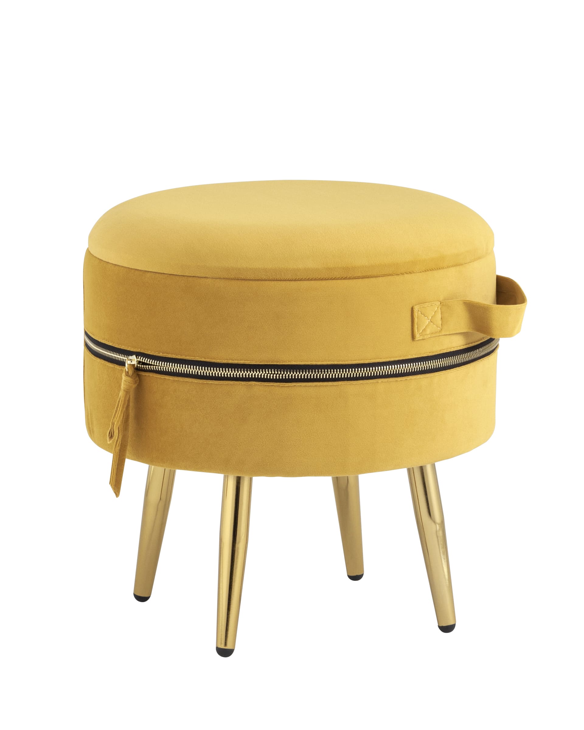 Оригинальный пуф, который дополнит интерьер спальни, прихожей или детской. Обивка выполнена из мягкого велюра с декоративной молнией. Под сиденьем имеется ящик для хранения различных мелочей. Ножки изготовлены из металла в золотом цвете. На них предусмотрены специальные подпятники, которые предотвращают скольжение и повреждения напольного покрытия.