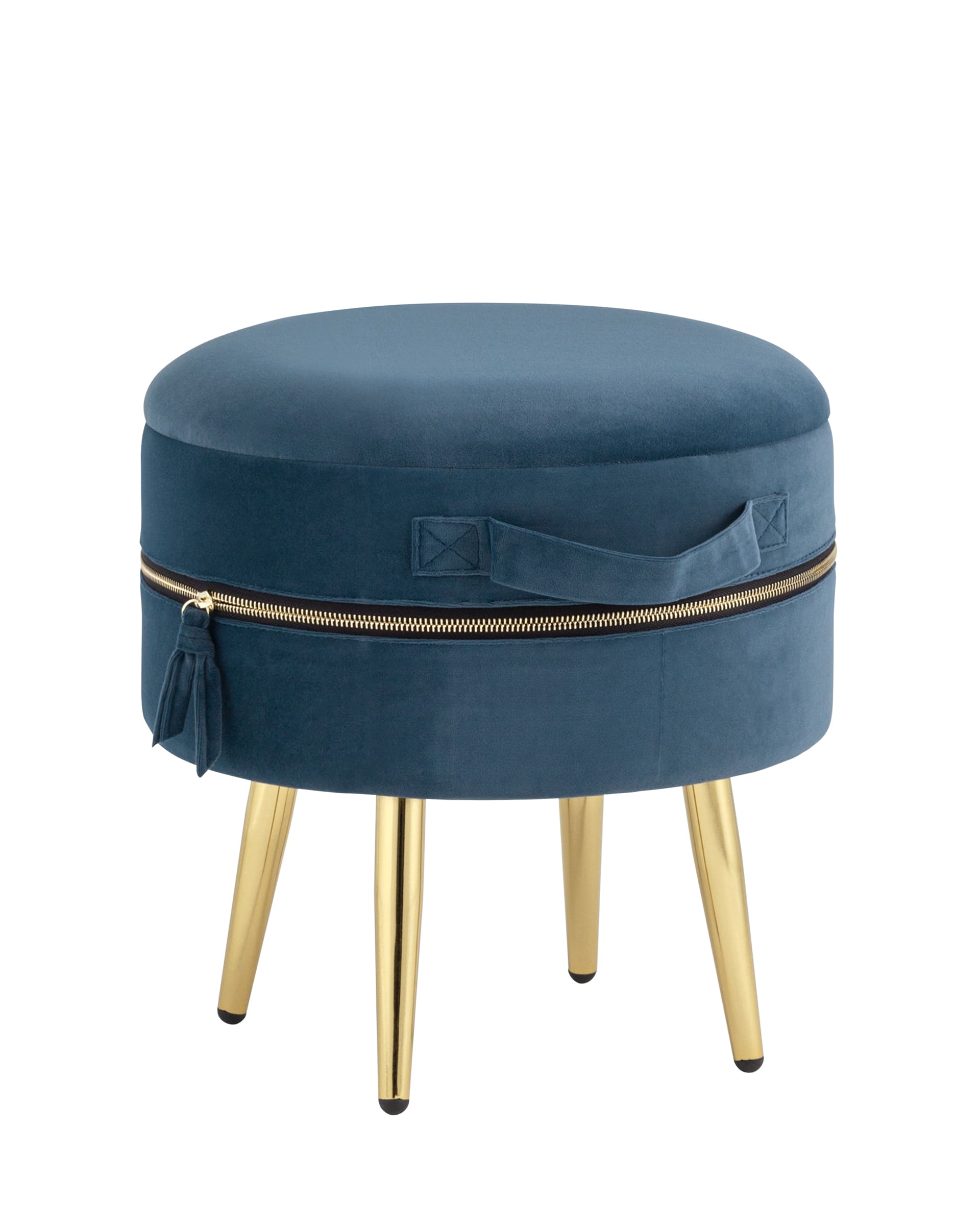 Оригинальный пуф, который дополнит интерьер спальни, прихожей или детской. Обивка выполнена из мягкого велюра с декоративной молнией. Под сиденьем имеется ящик для хранения различных мелочей. Ножки изготовлены из металла в золотом цвете. На них предусмотрены специальные подпятники, которые предотвращают скольжение и повреждения напольного покрытия.