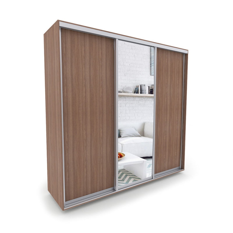 Центральная дверь из комплекта дверей-купе выполнена зеркальной, остальные двери - ЛДСП 10мм в цвет корпуса шкафа. Высококачественный толстостенный алюминиевый профиль цвета хром матовый.