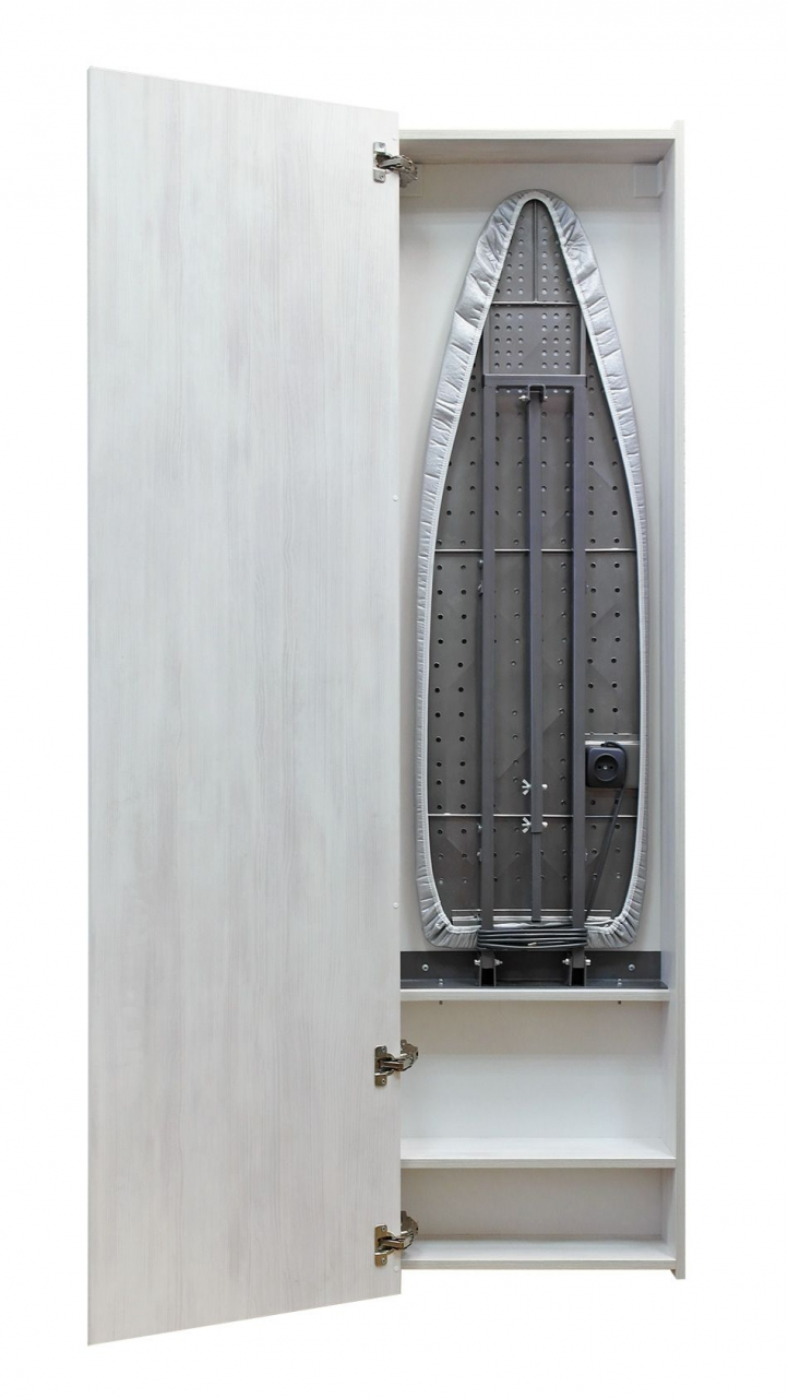 Шкаф со встроенной гладильной доской с зеркальным фасадом Iron Box Беленый дуб, распашная дверь, открытие влево