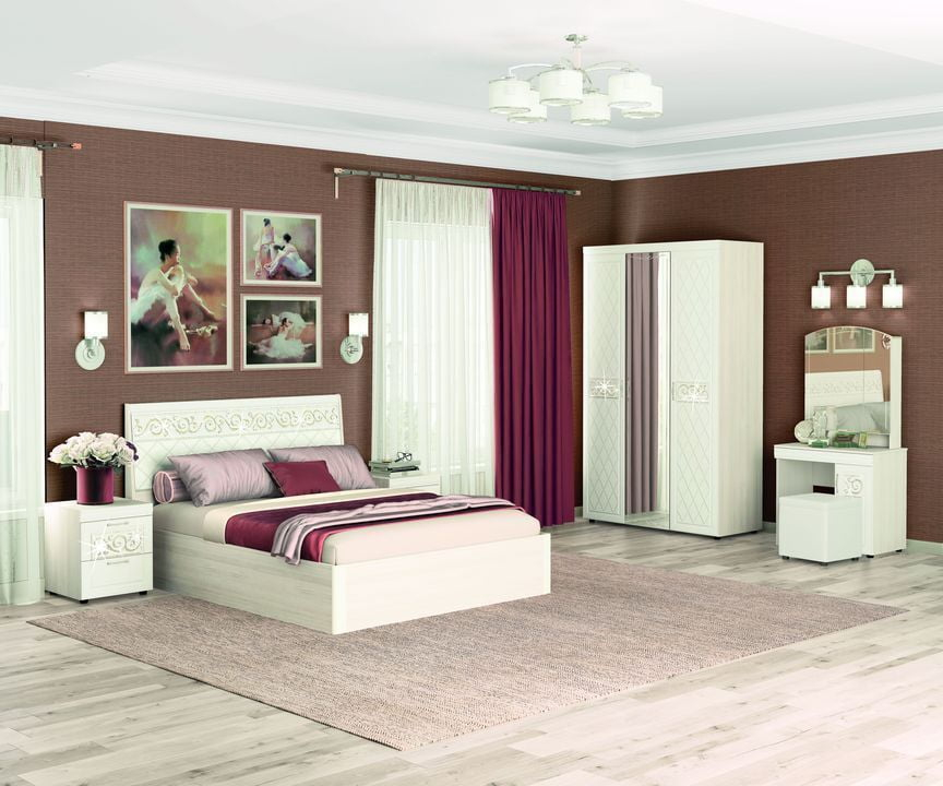 Нежная белизна фасадов и изысканность декора очаровывает с первого взгляда. Ажурная фрезеровка на фасадах дополнена глиттерным рисунком и кристаллами Swarovski®, что придаст Вашей спальне дополнительный шарм.