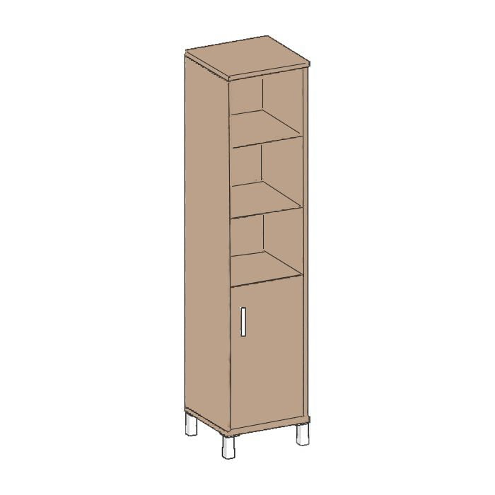 Каркасы шкафов выполнены из ЛДСП толщиной 25мм., кромка ПВХ т. 2мм.  Задняя стенка из ХДФ т.4мм разрезная в паз. Внутренние полки из ЛДСП 18мм., кромка ПВХ т.0,8 мм. ЛДСП т 25мм., кромка ПВХ т. 2 с фасадной стороны, кромка ПВХ т. 0,8 с трех сторон. В упаковке один горизонтальный щит, который можно устанавливать вверху или внизу изделия. Опора регулируемая, цвет алюминий. Дверь вкладная, из ЛДСП т. 18мм., кромка ПВХ т. 0,8мм. Ручка скоба, цвет алюминий.