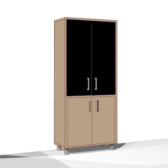 Каркасы шкафов выполнены из ЛДСП толщиной 25мм., кромка ПВХ т. 2мм.  Задняя стенка из ХДФ т.4мм разрезная в паз. Внутренние полки из ЛДСП 18мм., кромка ПВХ т.0,8 мм. ЛДСП т 25мм., кромка ПВХ т. 2 с фасадной стороны, кромка ПВХ т. 0,8 с трех сторон. В упаковке один горизонтальный щит, который можно устанавливать вверху или внизу изделия. Опора регулируемая, цвет алюминий. Стеклянная дверь в алюминиевой рамке, стекло - тонированное пленкой, бронза. Ручка скоба, цвет алюминий. Двери вкладные.