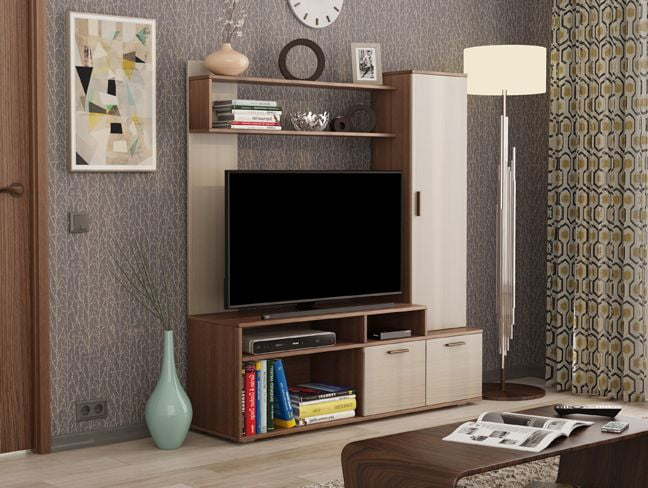Состоит из: места для телевизора, открытых полок и нижних шкафов