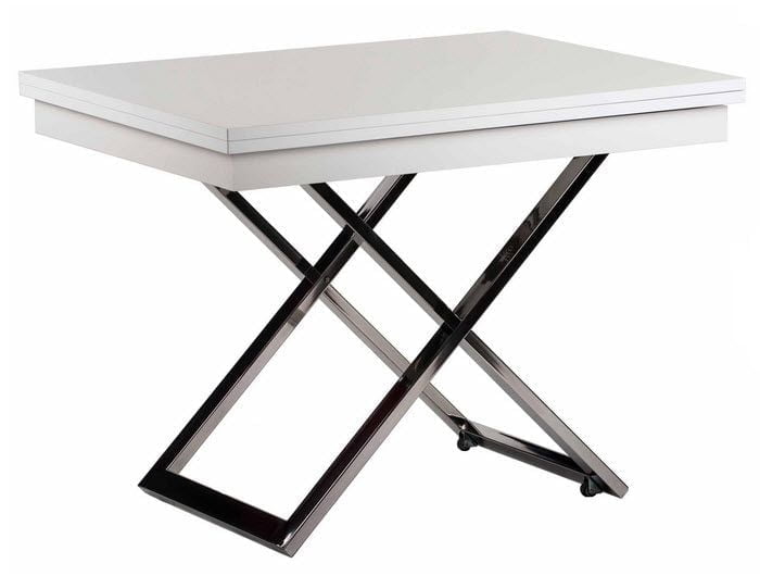 Стол-трансформер Cross — универсальная модель. В сложенном виде стол не занимает много места, и выглядит как небольшой журнальный столик. За счет механизмов регулирования высоты и площади столешницы, модель может принимать вид обеденного стола или полноценного рабочего места. В опоре стола используется высококачественная фурнитура. Поверхность столешницы матовая, что контрастирует с металлическими ножками модели.