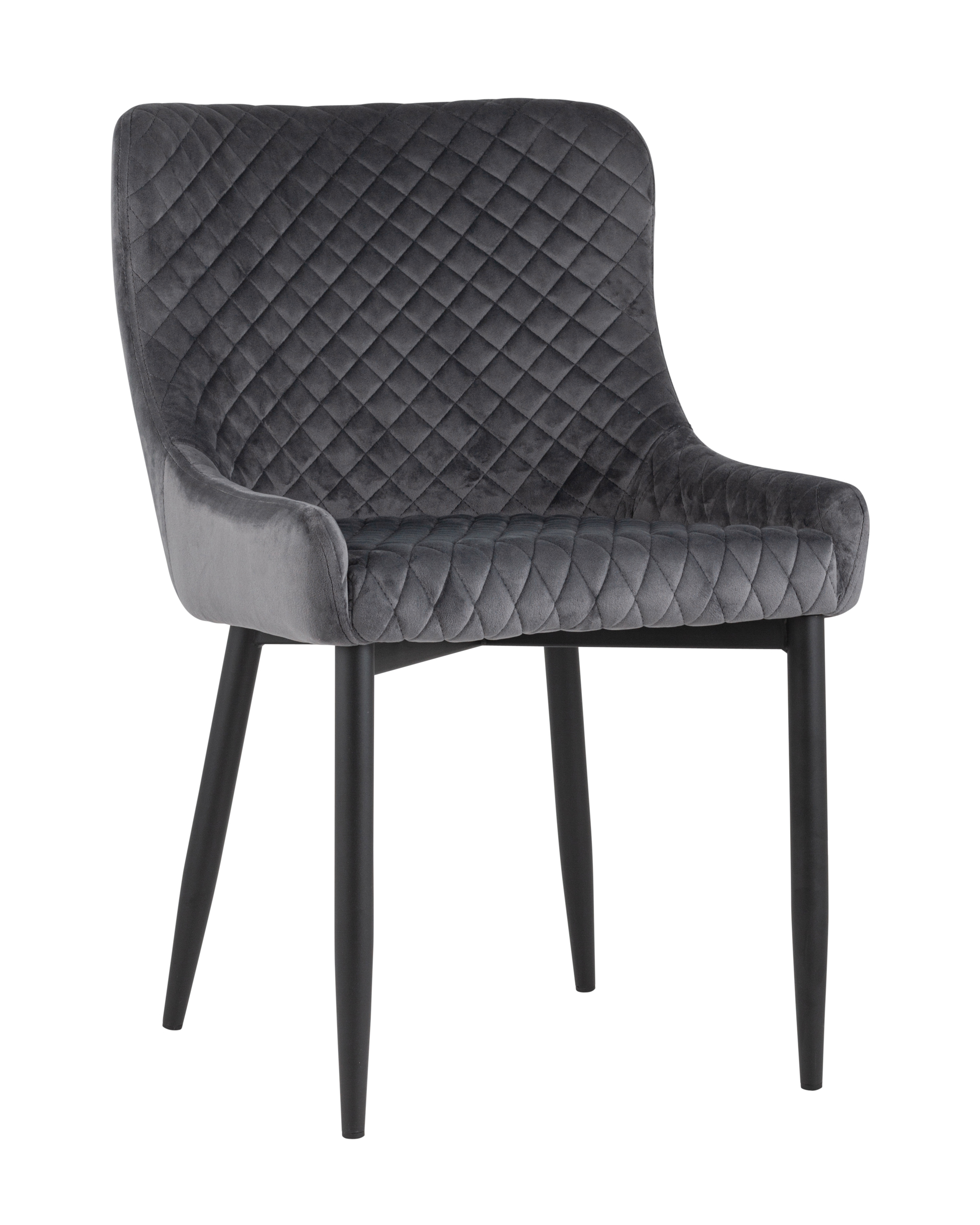 Мягкое прямоугольное сиденье с невысокой спинкой анатомической формы подарит комфорт и уют. В качестве обивки используются прочные износостойкие материалы с декором в виде ромбов. Прямые металлические черные ножки, имеют нестандартную форму в виде перевернутого конуса, поэтому обеспечивают хорошую устойчивость и делают стул оригинальным. Изделие прекрасно смотреться как отдельный предмет мебели, так и в комплекте с обеденным столом.