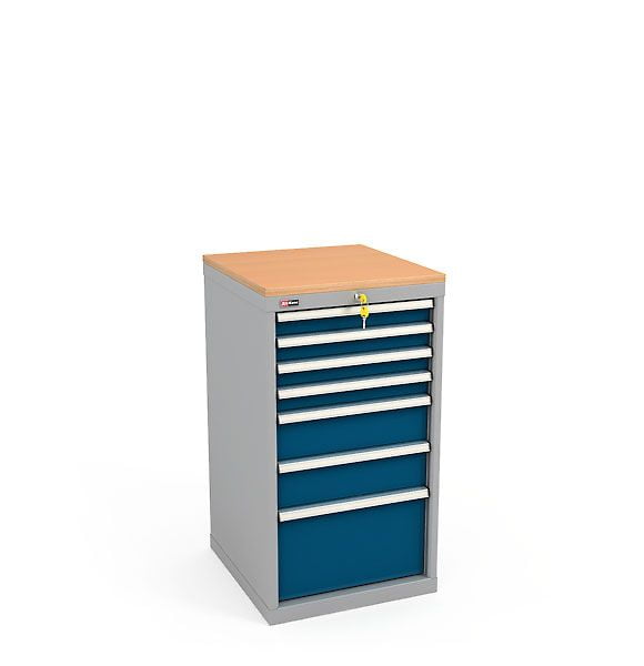 Семь выдвижных ящиков тумбы высотой 75 мм, 150 мм, 300 мм оснащены общим центральным замком EURO-LOCKS (Германия, 2000 комбинаций).