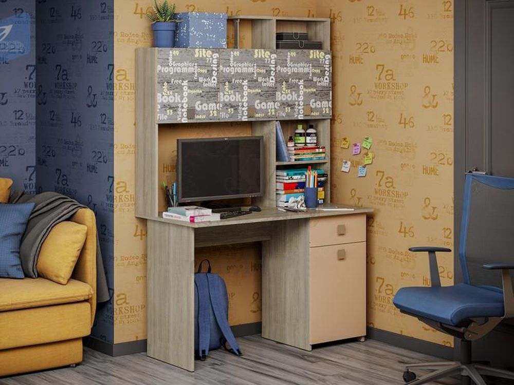 Размер под монитор – 766 х 490 мм. Уголок состоит из рабочего стола размером Д.1200 х В.750 х Г.578 мм. и надстройки размером Д.1200 х В.1076 х Г.220 мм. Есть тумба с одним выдвижным ящиком и створкой с полкой размером Д.400 х В.750 х Г.442 мм.. Надстройка состоит из закрытой фасадами с ПРИНТОМ полки и открытой ниши сбоку над тумбой. Данная модель имеет возможность собираться как на левую, так и на правую сторону.